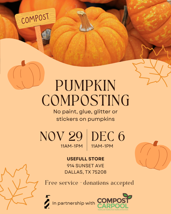 Don't let your pumpkins go to waste! In partnership with Compost Carpool, we'll be taking your pumpkins to be composted, so these nutrient rich materials can be turned into compost to feed the soil.