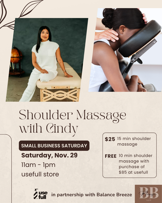 Carrying stress in your shoulders? Let Cindy from Balance Breeze work her magic. Snag a free 10-minute massage with any $85 usefull purchase, or $25 for 15 minutes. Stop by November 29th (11am-1pm) as part of our Small Business Saturday celebration - you deserve it!