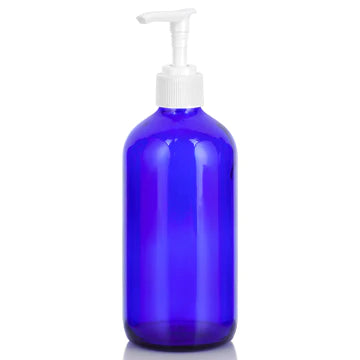 Boston round glass bottles are sturdy, great for soaps, shampoo, conditioner, lotions and more. The blue tint protects contents against UV rays. White pump included.